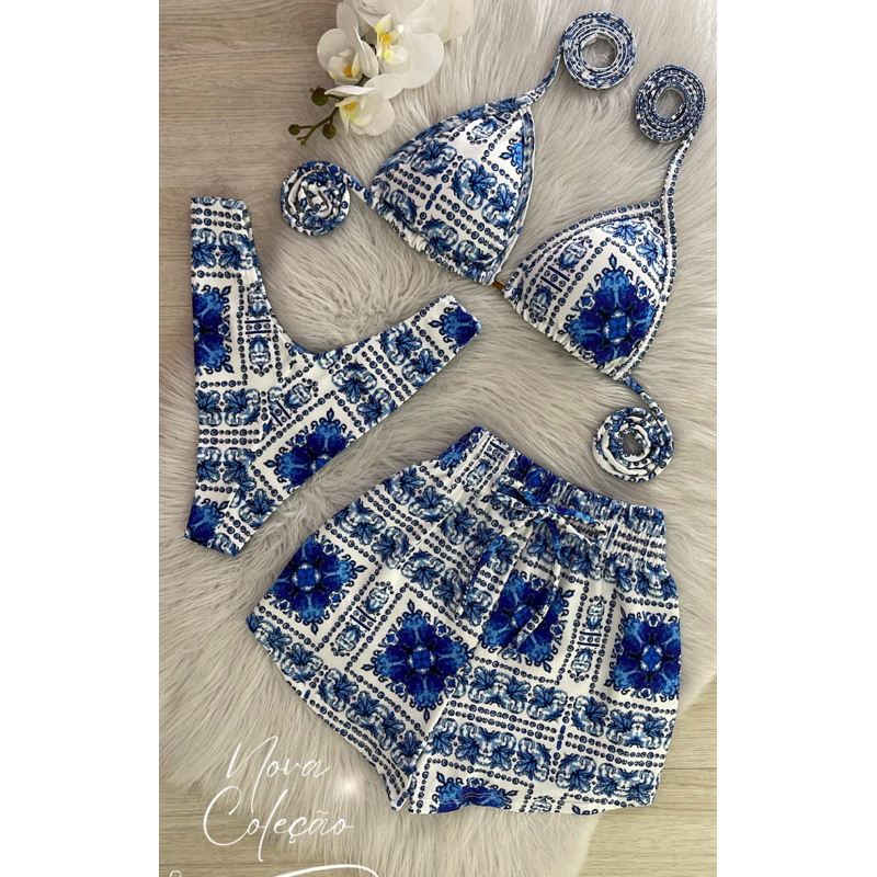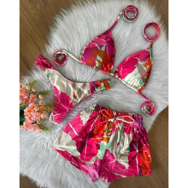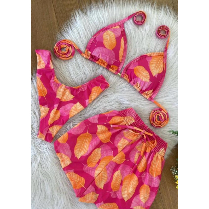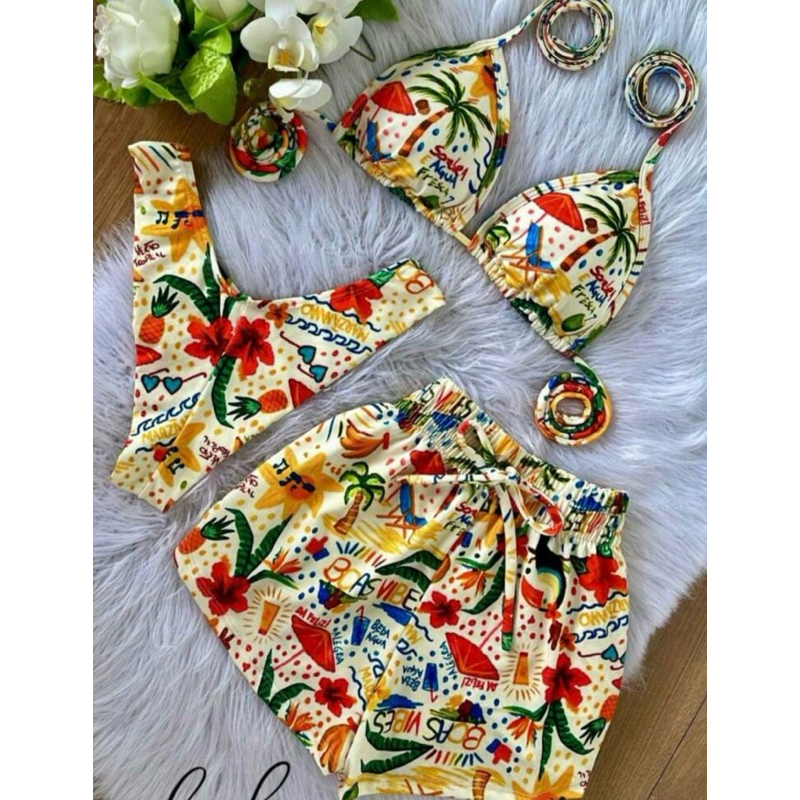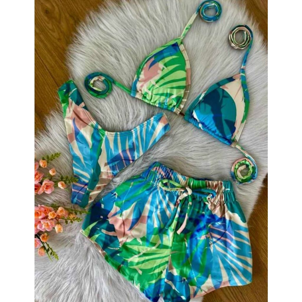 Conjunto com 3 peças , ele acompanha o shorts ,calcinha e sutiã Biquini com bojo, calcinha que se ajusta ao corpo empina bumbum , modelo sutiã cortininha , diversas estampas e tamanhos , tecido poliamida Tamanhos P 38-40 M 42-44 G 44-46