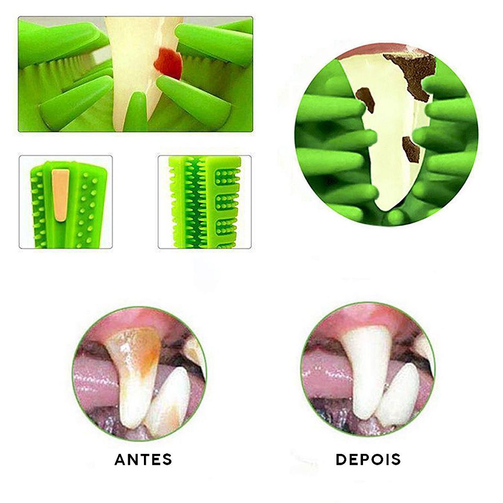 A escova age prevenindo o acúmulo de alimentos e a formação do tártaro, evitando doenças bucais e o mal hálito do seu melhor amigo de quatro patas!