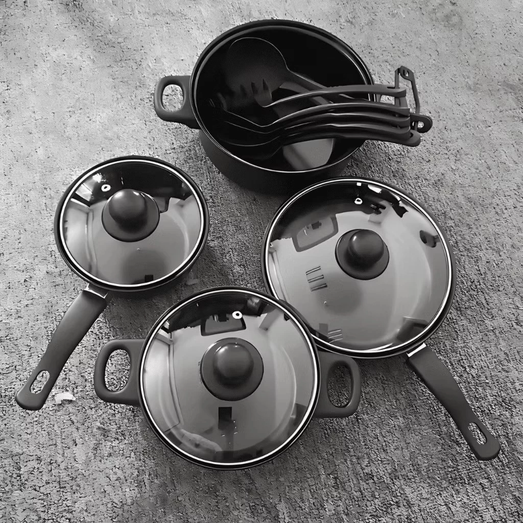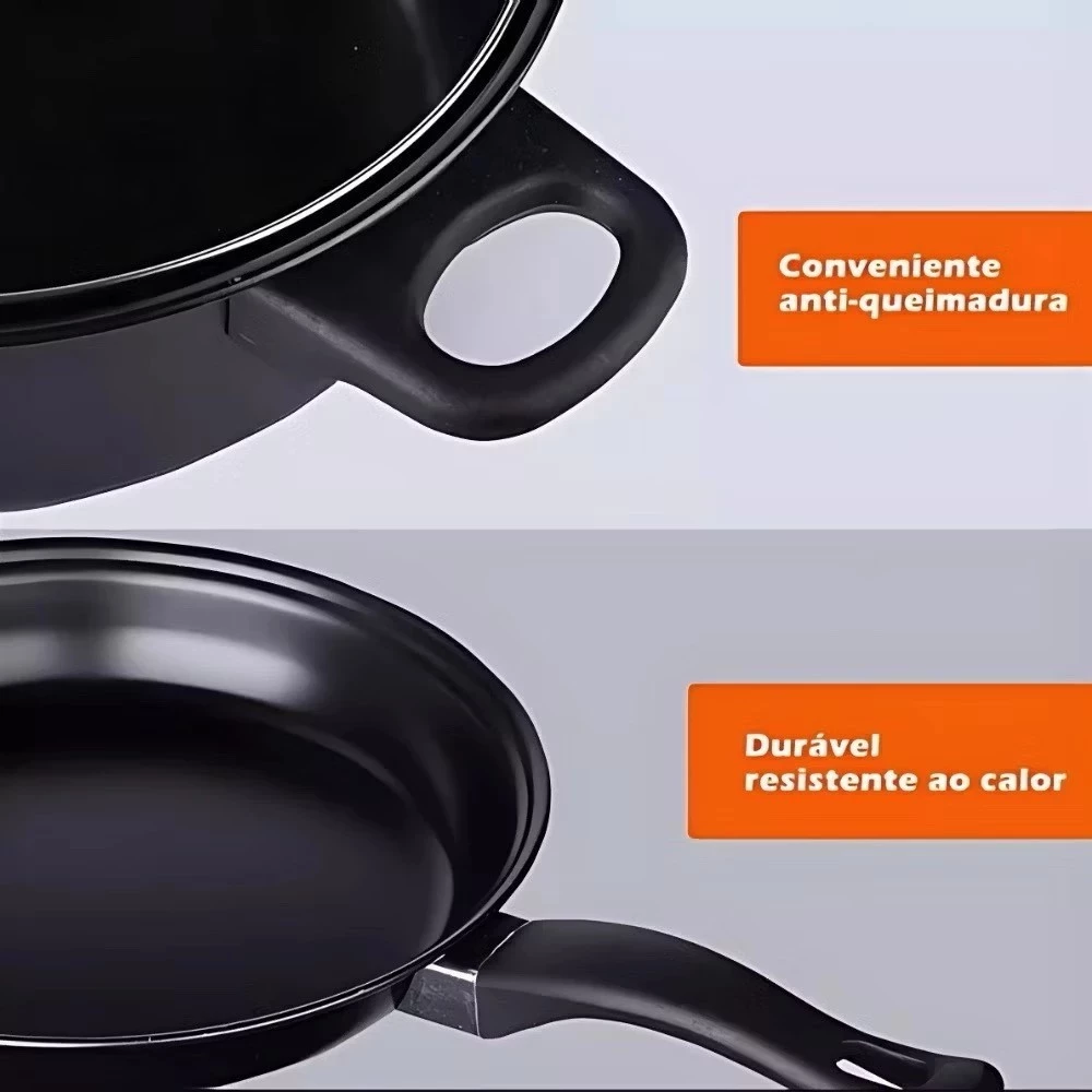 Esse conjunto de panelas é com revestimento em teflon anti aderente, revestida por dentro e por fora, o que facilita muito a limpeza das panelas e aumenta bastante o tempo de vida útil das suas panelas.