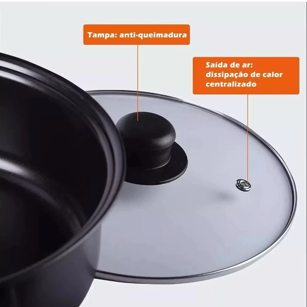 Todas as panelas desse conjunto possuem tampa de vidro temperada que são super resistentes, as tampas também possuem saída de vapor que é item de segurança imprescindível para sua família. Todos os cabos e poméis são de baquelite, material que não esquenta para garantir sua segurança na hora do manuseio das tampas e cabos.