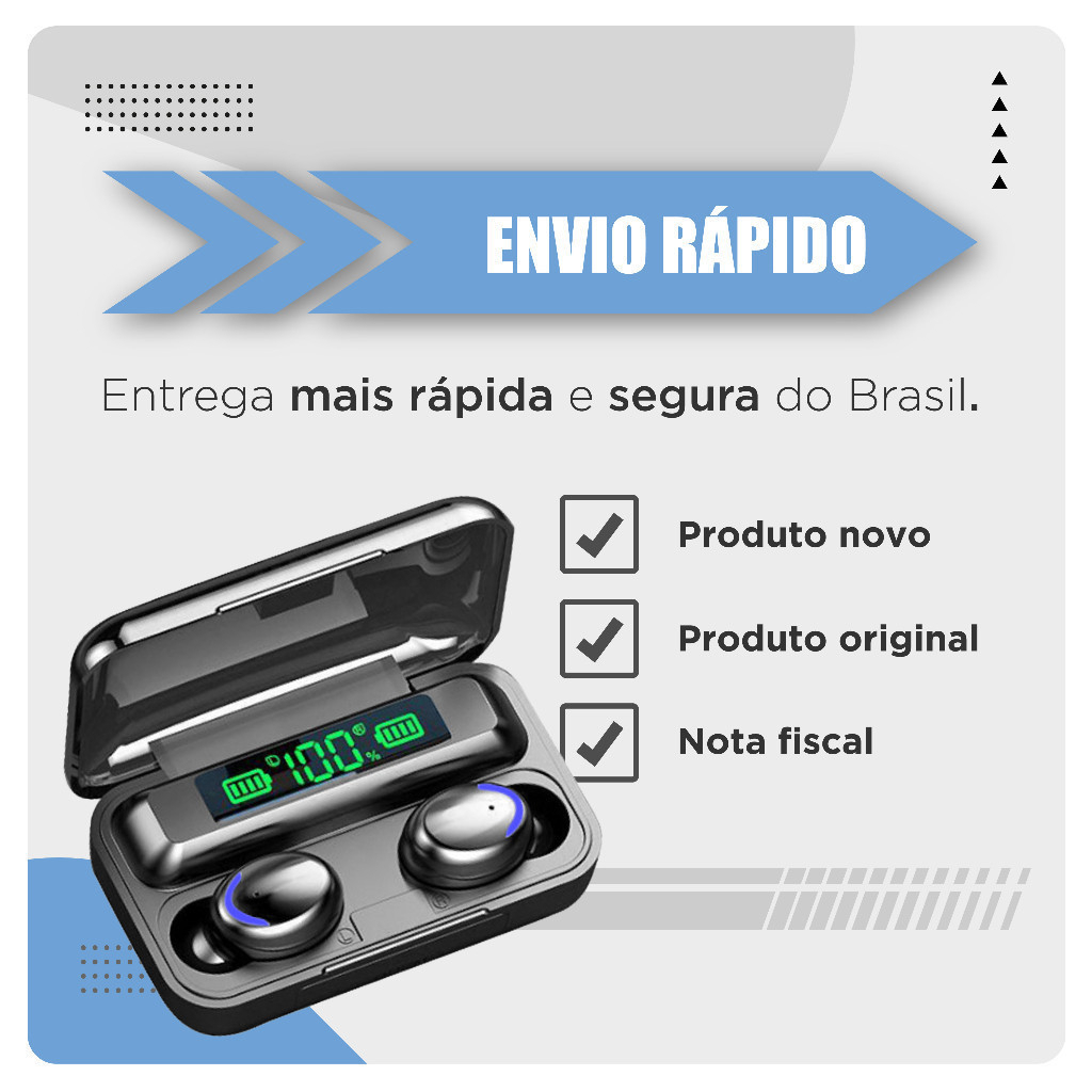 ============================== ATENÇÃO: VERSÃO ATUALIZADA COM BLUETOOTH 5.3! NOSSA VERSÃO É A QUE POSSUI A MAIOR BATERIA E QUALIDADE SONORA DO MERCADO! ENVIO RÁPIDO PARA TODO BRASIL ================================= Fone De Ouvido Bluetooth TWS F9-5 Bluetooth 5.3, com função Power Bank e microfone para atender chamadas telefônicas. Estes fones de ouvido Bluetooth foram projetados para permitir que você desfrute de som Surround Imersivo com excelente qualidade de chamada e unidades Premium e tecnologia de cancelamento de ruído. Possui display LED para mostrar o status da bateria em tempo real. ESTE CARREGADOR TAMBÉM É UM POWER BANK, carrega a bateria do seu celular através da entrada frontal USB. Possui microfone para atender chamadas telefônicas com apenas um toque. Som Surround Premium. Sensibilidade : 95+3db Conectividade : Sem fio Versão de Bluetooth: V5.3 + EDR Tempo para Música : 4 a 5h aproximadamente Tempo de conversação: 4 a 5h aproximadamente Tempo de Carregamento : 1 a 2h Distância de transmissão : 10 M Bateria do Fone : 35 mAh Resposta de Freqüência : 50-8KHZ Compatível com : Todos aparelho com bluetooth Função: Telefone de atendimento , Bluetooth , Microfone , Música , À prova de suor , Controle de voz. Acompanha case de carregamento, e pode ser usado como PowerBank para carregar o fone de ouvido ou até mesmo o seu celular Os fones de ouvido Bluetooth apresentam um ótimo efeito de som Surround para proporcionar uma experiência de audição imersiva de altíssima qualidade. Possui microfone para atender chamadas telefônicas. Basta um toque e o fone possibilita o atendimento telefônico sem precisar tocar no celular, no iPhone precisa deixar habilitado o aplicativo destes fones no Bluetooth: F9. Excelente qualidade de chamada telefônica. Trabalhando com tecnologia avançada de cancelamento de ruído, os fones de ouvido reduzem o ruído do mundo exterior e captam sua voz e depois a transmitem com alta clareza. Conteúdo da caixa: * 2 fones de ouvido * 2 pares extras de borrachinhas * 1 case de carregamento * 1 cabo USB * manual em inglês *QR code com o manual em português PERGUNTAS FREQUENTES – É compatível com iOS? R: Sim, pode ser usado com qualquer aparelho bluetooth. – É compatível com Android? R: Sim, compatível com diversos aparelhos. – Posso usar com computador/notebook? R: Sim, desde que o aparelho tenha bluetooth. – Tem como trocar de música pelo fone? R: Sim, basta tocar 2 vezes no fone da direita para avançar ou tocar 2 vezes no fone da esquerda para retroceder. – Funciona só um fone ou tem que usar os dois ao mesmo tempo? R: Funciona sozinho também, aliás, se os fones estiverem longe, consegue conectar um em cada celular. – Como identificar o lado direito e esquerdo? R: Na parte interna dos fones tem as marcações “L” (esquerdo) e “R” (direito).